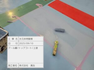 プールの内面は、防水層の上にトップコートや塗装材を塗って仕上げています。