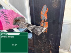 ケレン作業で古いサビを取り除きます。そのまま塗装を進めてしまうと、数年でまたすぐにサビが発生し、塗膜が剥がれる原因になります。