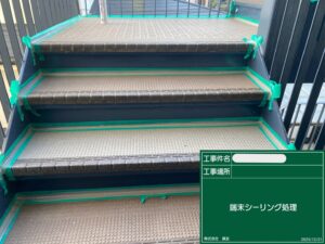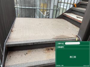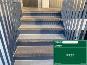 鉄部塗装工事とタキステップ交換工事を行い、見た目だけでなく安全面も改善された、安心してご利用いただける階段になりました。