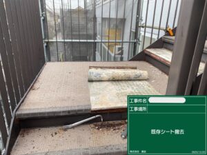 劣化したシートを剥がし、下地の状態を確認し、段板の不陸や傷みがある場合は補修も行います。