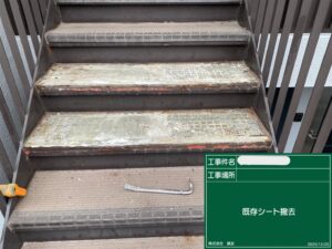 劣化したシートを剥がし、下地の状態を確認し、段板の不陸や傷みがある場合は補修も行います。