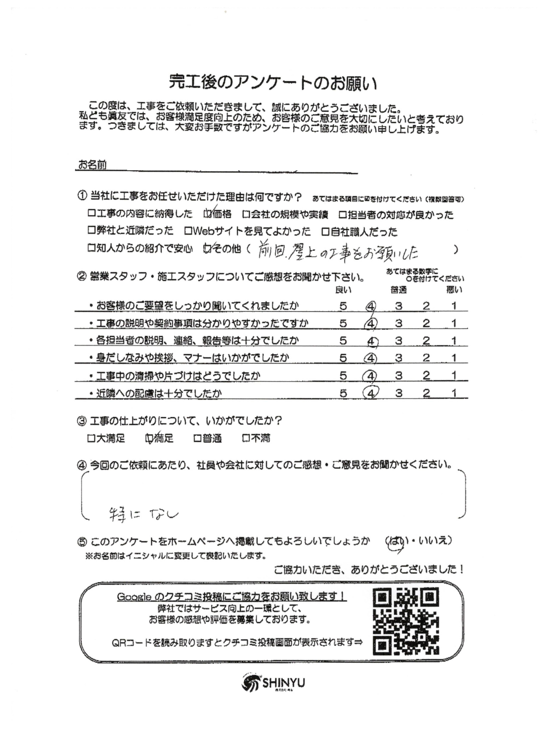 葛飾区堀切にて外壁塗装工事・防水工事 以前、屋根工事をお願いしました。 当社に工事をお任せいただけた理由は何ですか? ・価格 ・前回の工事の満足度 お客様のご要望をしっかり聞いてくれましか? 4点(5段階評価) 工事の説明や契約事項はわかりやすかったですか? 4点(5段階評価) 各担当者の説明、連絡、報告等は十分でしたか? 4点(5段階評価) 身だしなみや挨拶、マナーはいかがでしたか? 4点(5段階評価) 工事中の清掃や片付けはどうでしたか? 4点(5段階評価) 近隣への配慮は十分でしたか? 4点(5段階評価) 工事の仕上がりについて、いかがでしたか? 大満足 満足 ふつう 不満 前の記事 一覧へ戻る